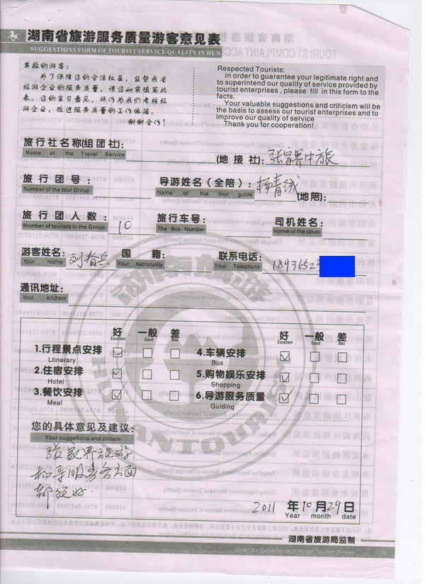 江蘇淮安劉先生10人旅游質(zhì)量回饋:張家界旅游楊導服務各方面都很好!