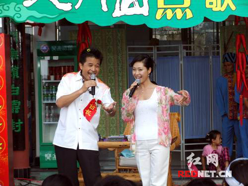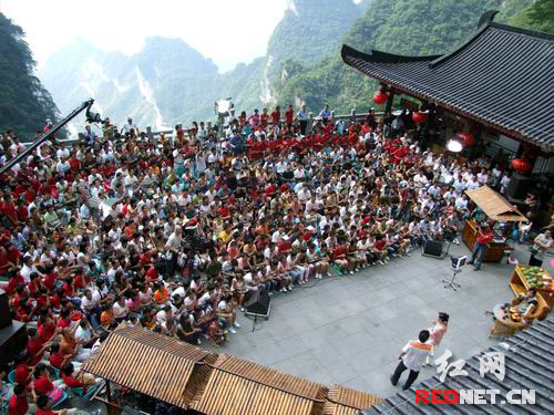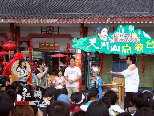 下午三點(diǎn),節(jié)目錄制正式開始。在天門洞下的露天平臺上,央視著名主持人畢福劍——老畢以虛擬的“畢路電視臺天門山點(diǎn)歌臺”臺長的身份詼諧登場,他把他的“畢路電視臺”幽默的解釋為:姓畢的創(chuàng)辦的電視臺和必須錄制的節(jié)目,“畢路電視臺天門山點(diǎn)歌臺”這次請來了鄭智化和于文華兩位著名歌手,他們以觀眾點(diǎn)歌的形式,進(jìn)行現(xiàn)場“PK”,充分展現(xiàn)“國慶七天樂,點(diǎn)歌也快樂”的節(jié)目主題。